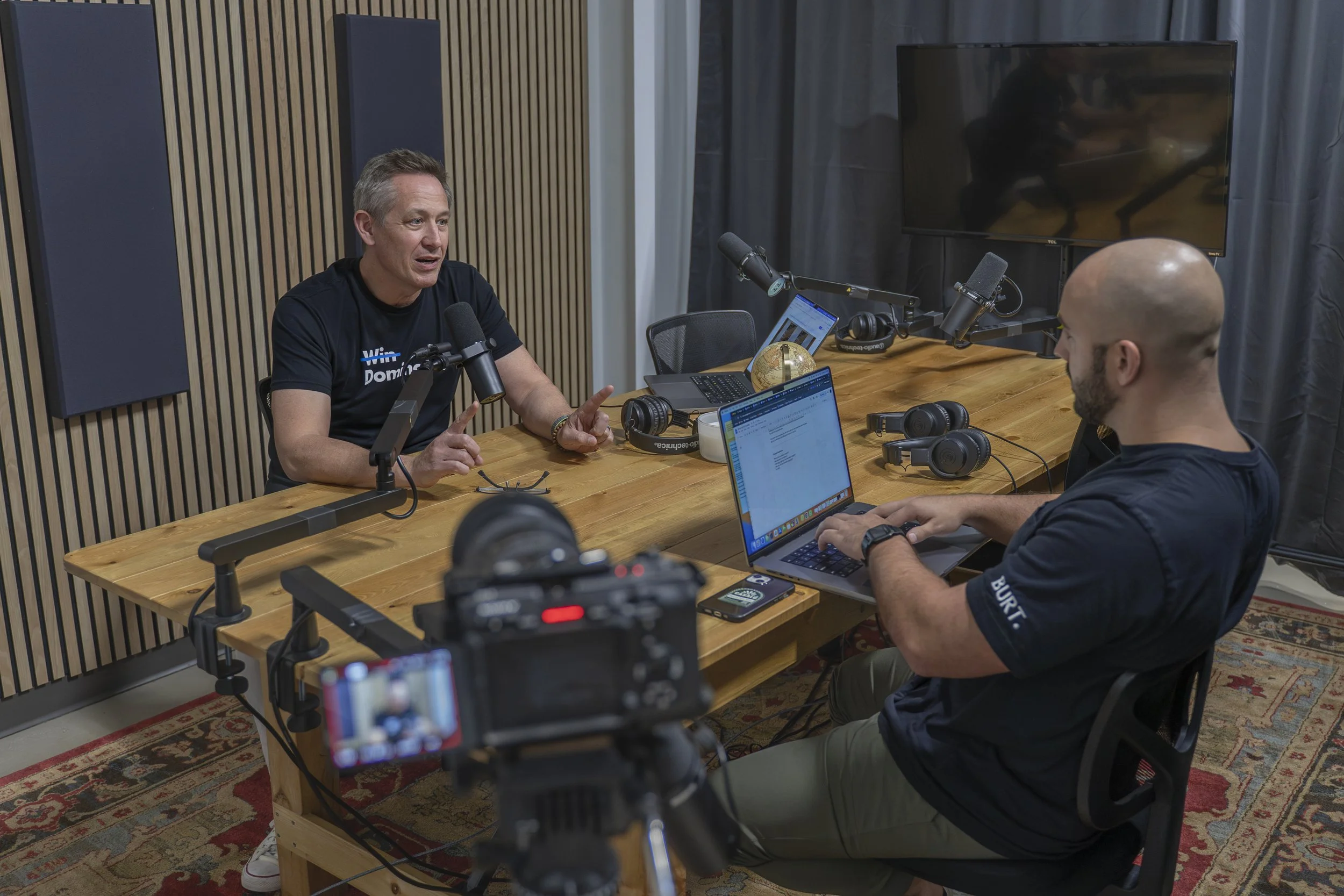 On recording day, you focus on the conversation while we manage cameras, audio, lighting, and technical direction for a smooth production.