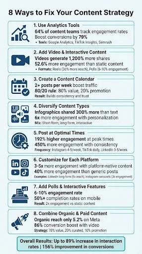 Is your content failing to connect with your audience? Here’s the solution: focus on strategies that boost engagement, create real connections, and drive results. This article breaks down 8 actionable tactics to improve your content strategy and turn passive viewers into active, loyal followers.