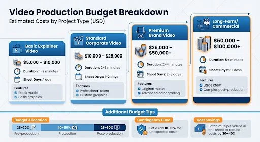 | Standard Corporate | $10,000 – $25,000 | 2–3 minutes, 1–2 shoot days, professional talent, custom graphics |